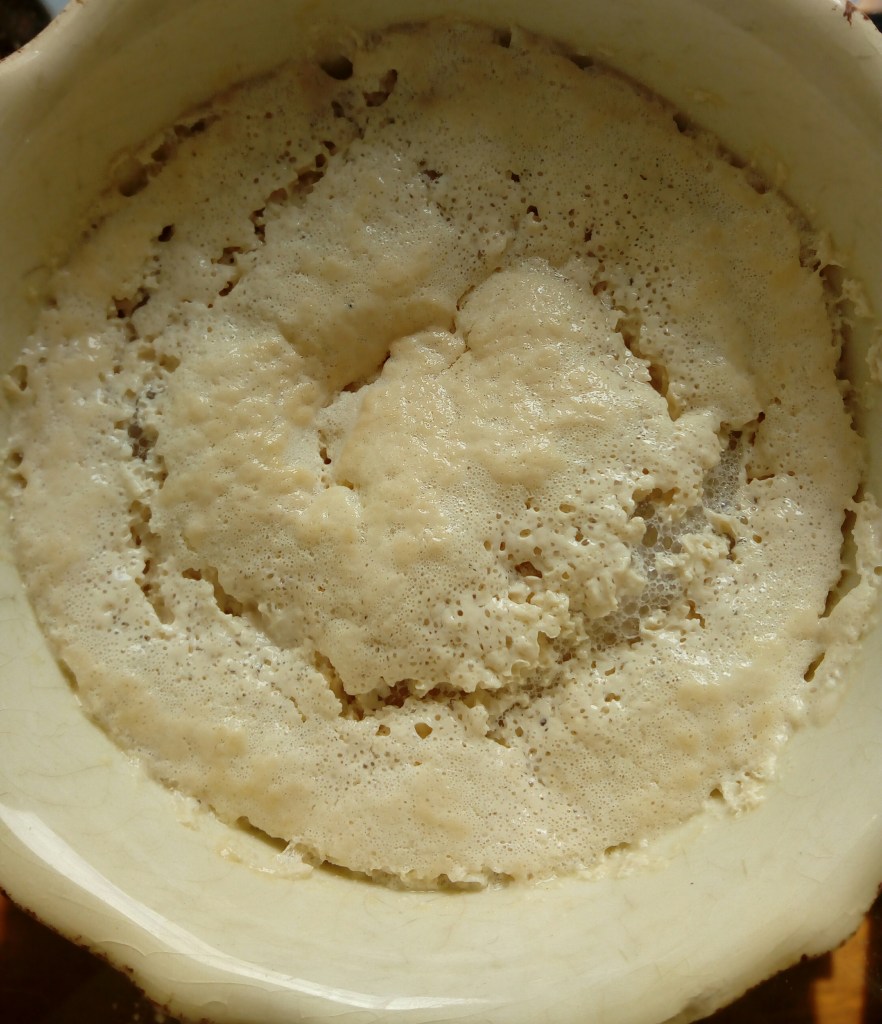 100 g de agua, 100 g de harina, 0,25 g de levadura seca de panadero – si usas levadura fresca dobla o triplica la cantidad-, y dejar reposar tapado durante 12 horas en un lugar cálido.