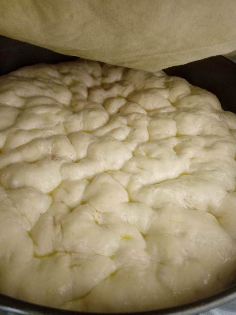 Después del reposo estira la masa con los dedos, como un pañuelo -para que suelte el gas de la fermentación- ponla en el molde, y unta con un poco de aceite presionando suavemente con los dedos. Espolvorea con la sal y añade el romero si es de tu gusto.