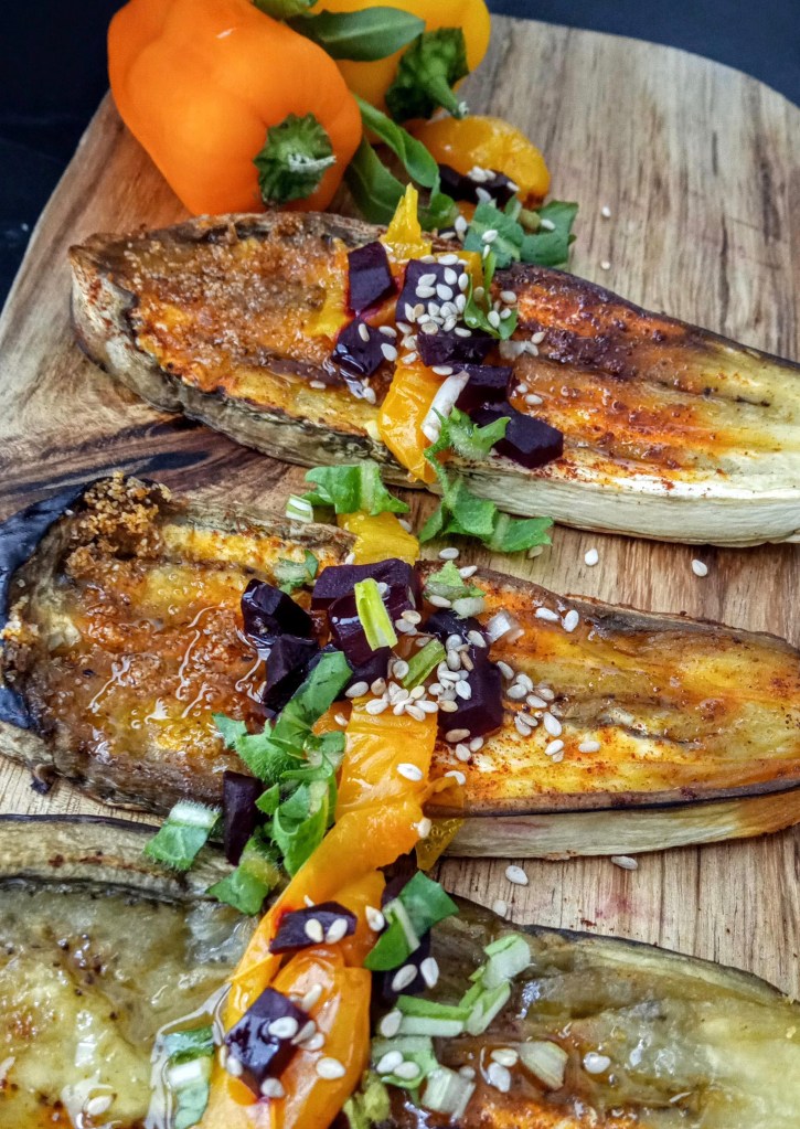•Saltear unas rodajas de berenjena sin pelar.